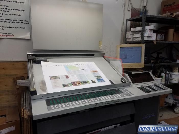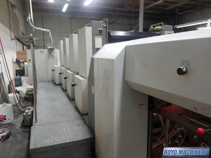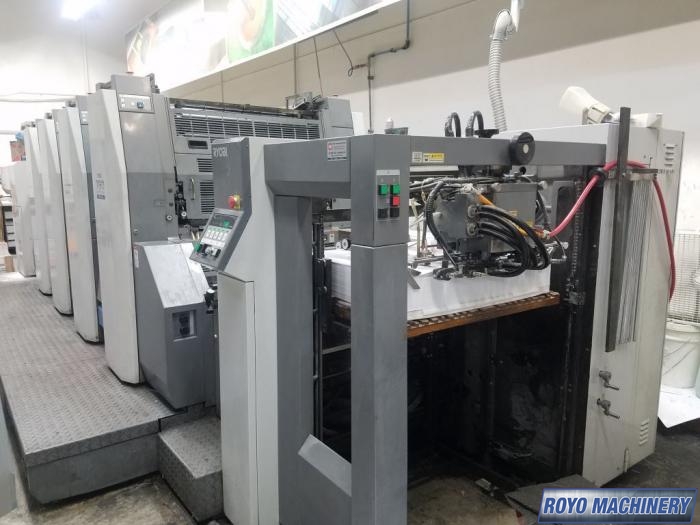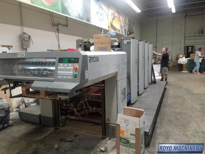 Automatic Blanket Roller and Impression Cylinder Wash, Stream feeder, Steel plate in delivery, Autoplate (semiautomatic plate changer), High pile delivery, PDS-E Print density control with CIP4, Air transfer system, Preset, PCS Color Console, Lateral and circumferential register control, Electronic sidelay control, Diagonal Register, Chrome Blanket Cylinders, Pin Register on Clamps, 15000 sph, Suction Tape on Feeder, PCS-G Printing Control system, Ultrasonic double sheet detector, Ryobimatic continuous dampening system, Sheet Decurler, Technotrans Refrigerated Recirculator, Powder Spray, Max. Sheet Size: 23.62" x 31.02"