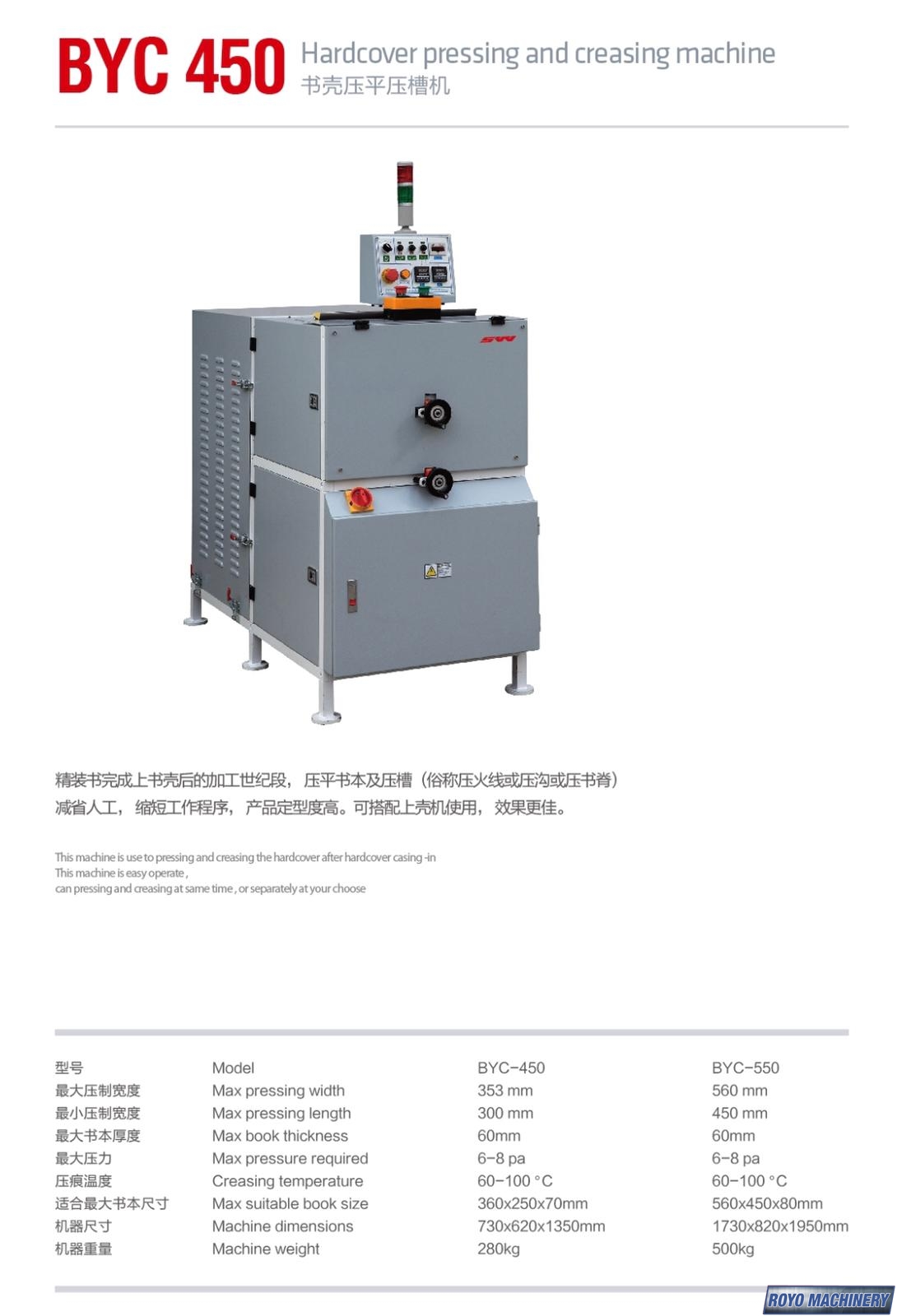 Weight: 280kg / 620lbs, Max. Book Size: 360x250x70mm, Air Pressure Required: 6-8 Bars, Max. Pressing Width: 353mm, Max. Pressing Length: 300mm, Max. Book Thickness: 60mm, Dimensions: 730x620x1350mm, Creasing Temperature: 60-100 Celsius