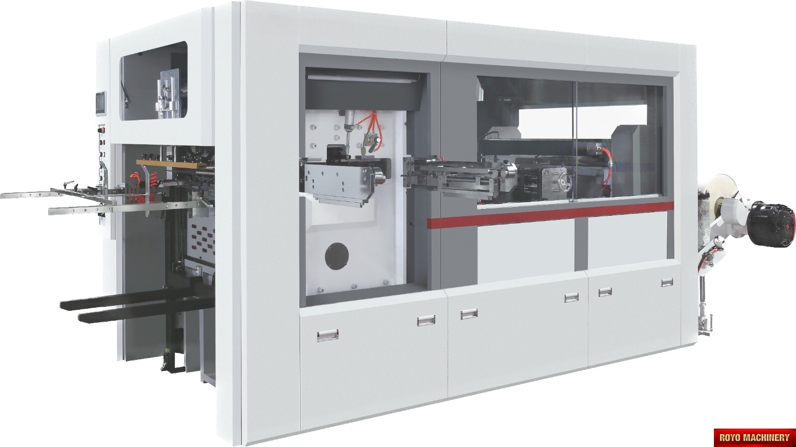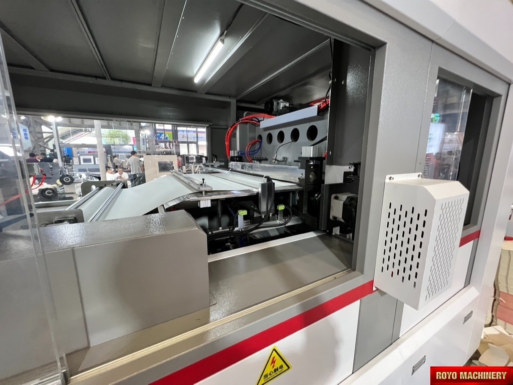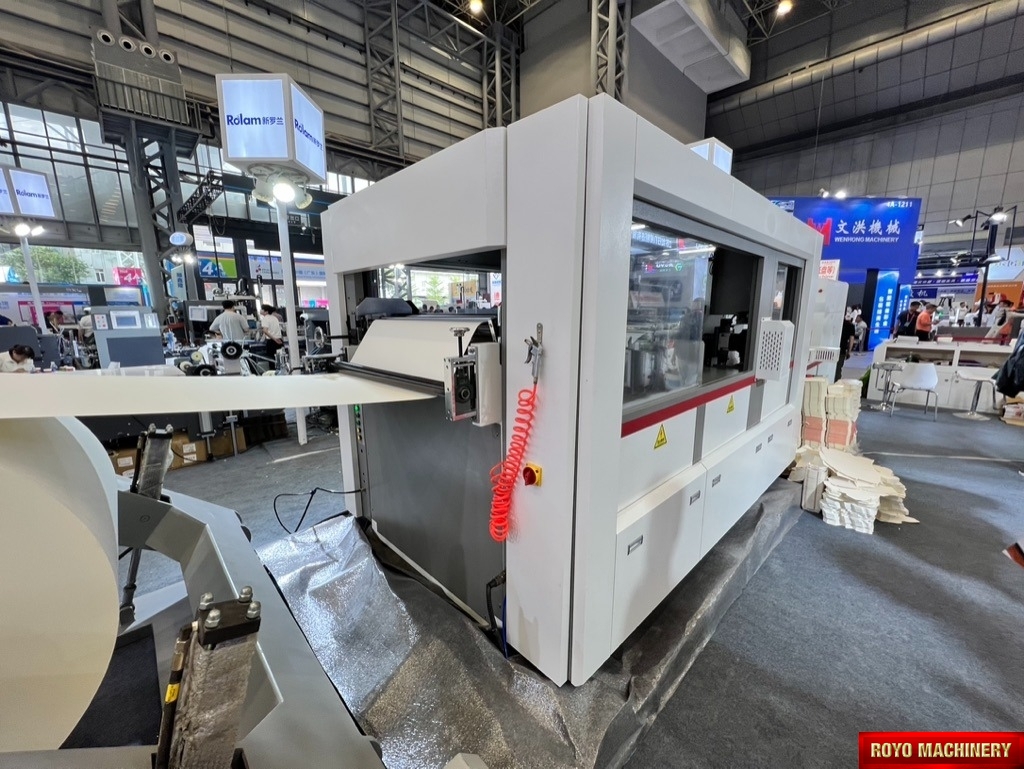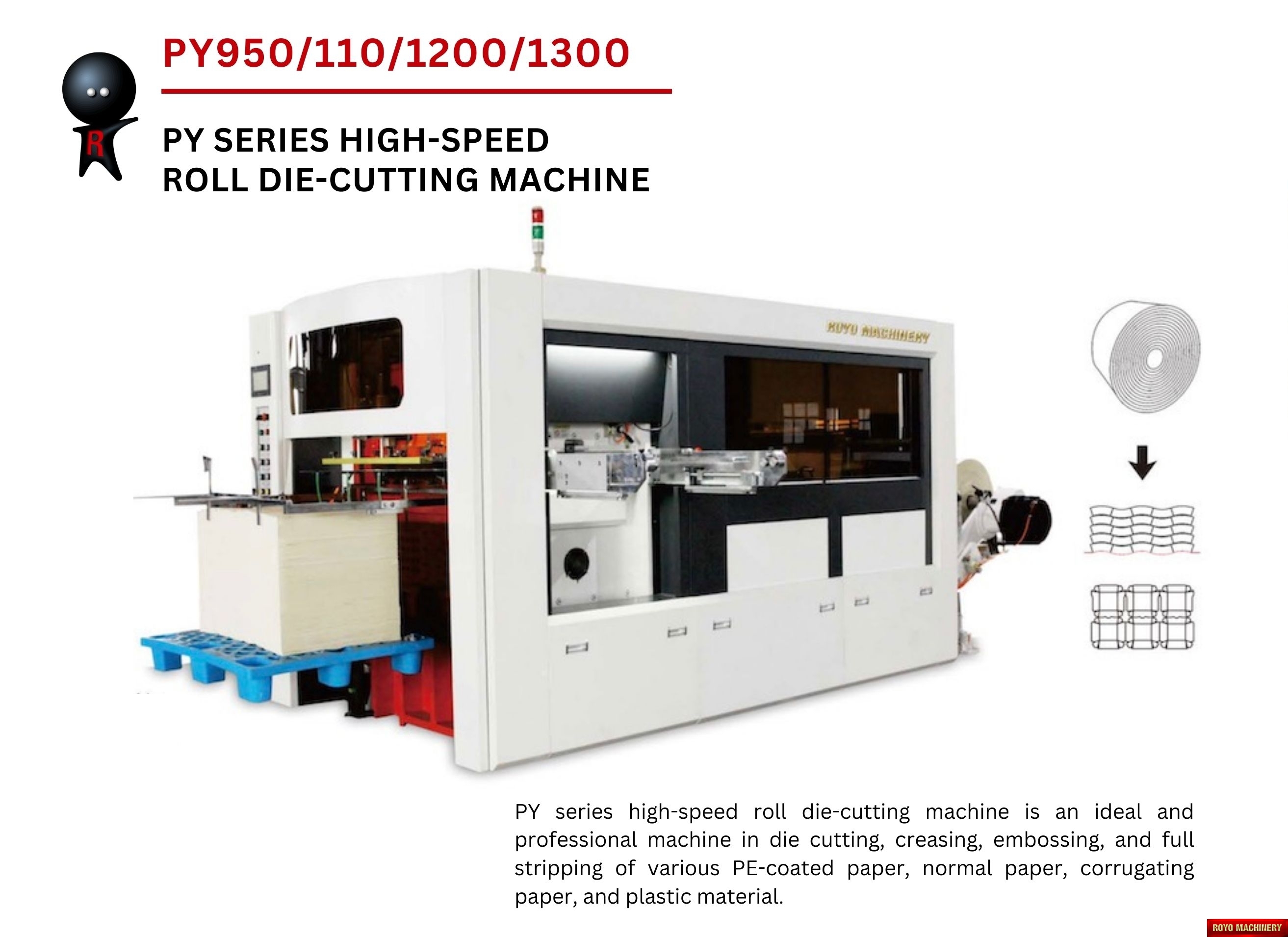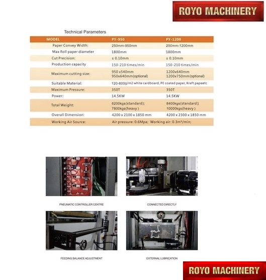Register mark sensor with color recognition, Total Power: 14.5kw, Precision: +-0.10mm, Maximum roll diameter: 1800 mm, Max. Speed: 12000 strokes per hour, Max. Die cutting size 950 x 540 mm, Max. Die Cutting Pressure: 350 Tons, Material thickness: 100-800 gsm, Dimensions (LxWxH): 4200 x 2100 x 1850 mm, Weight 7t