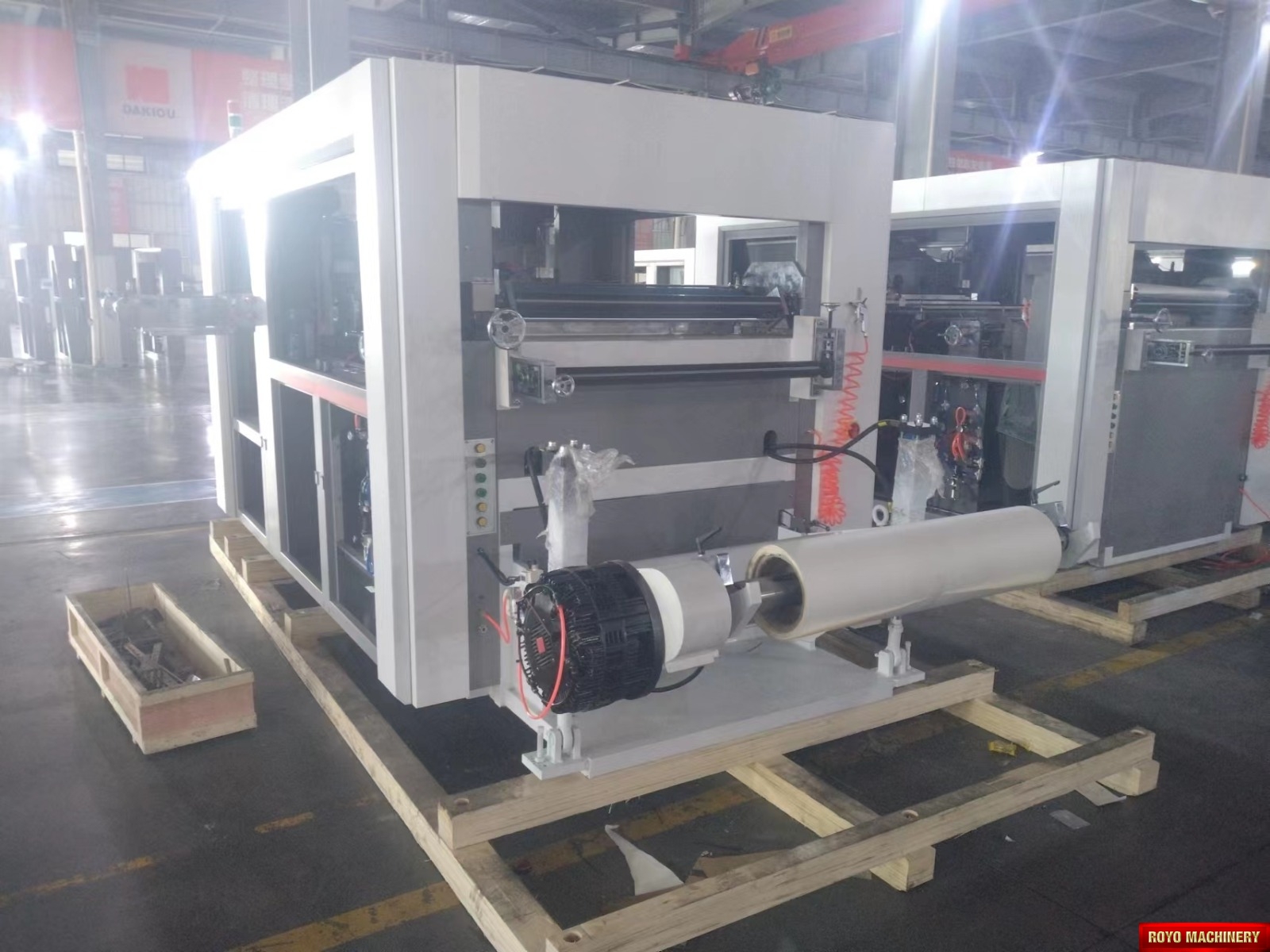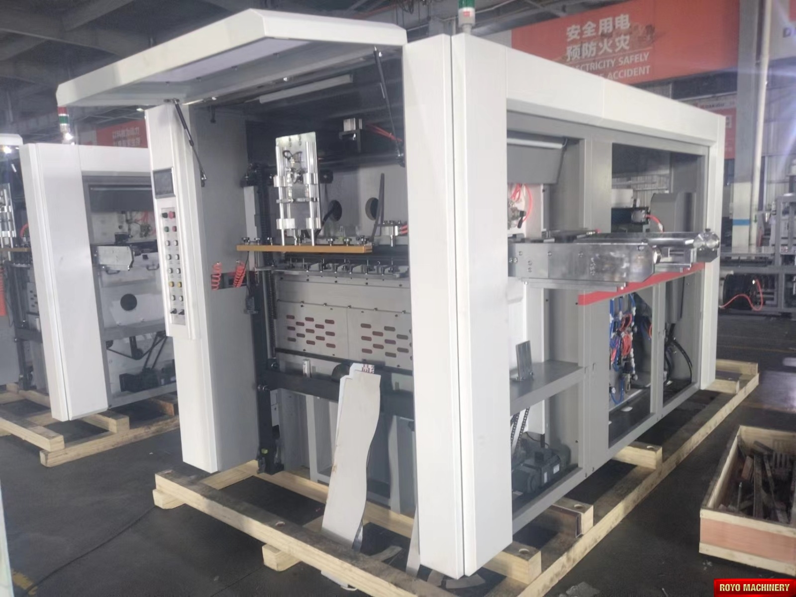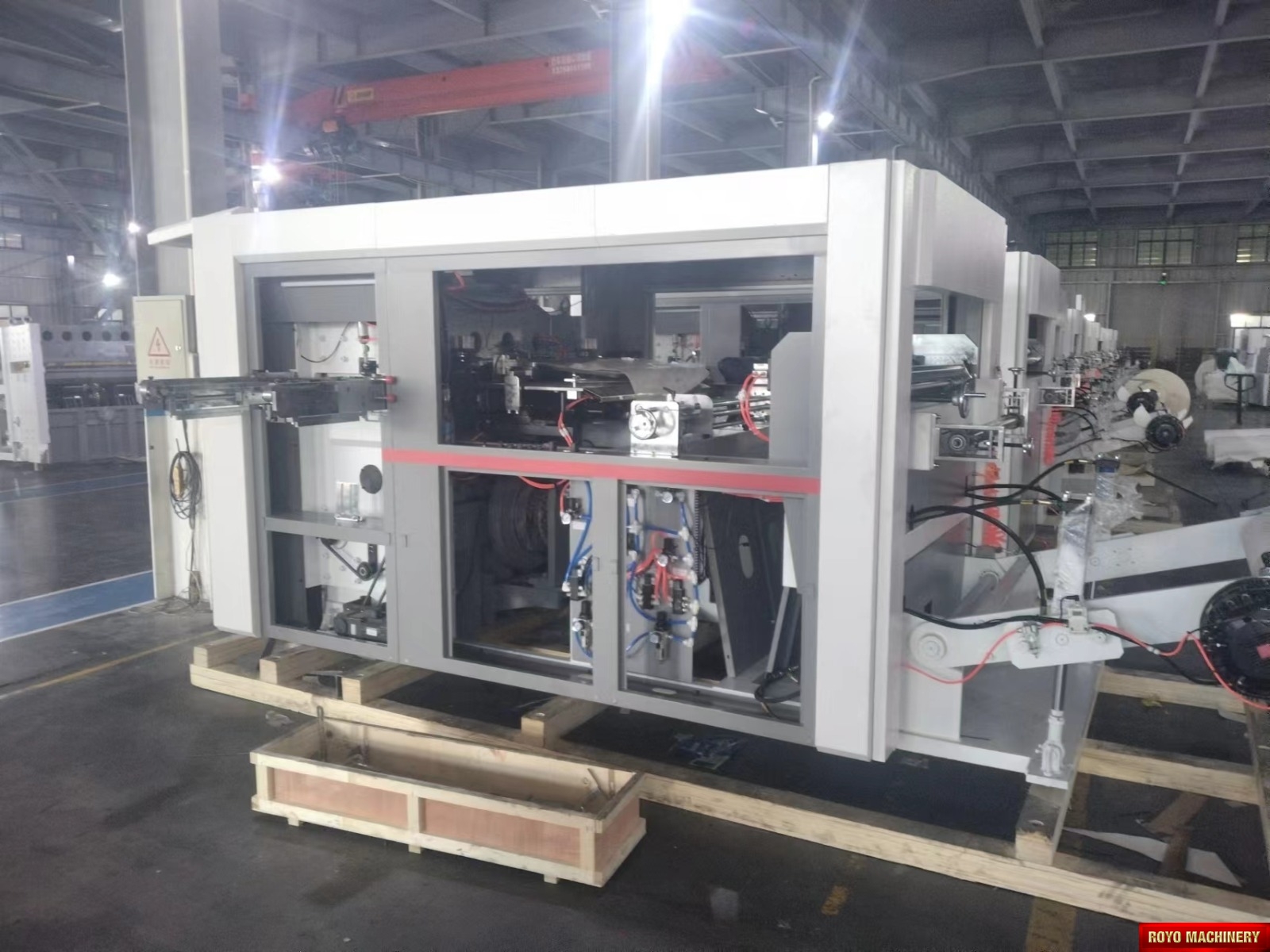 Register mark sensor with color recognition, Total Power: 14.5kw, Precision: +-0.10mm, Maximum roll diameter: 1800 mm, Max. Speed: 12000 strokes per hour, Max. Die cutting size 950 x 540 mm, Max. Die Cutting Pressure: 350 Tons, Material thickness: 100-800 gsm, Dimensions (LxWxH): 4200 x 2100 x 1850 mm, Weight 7t