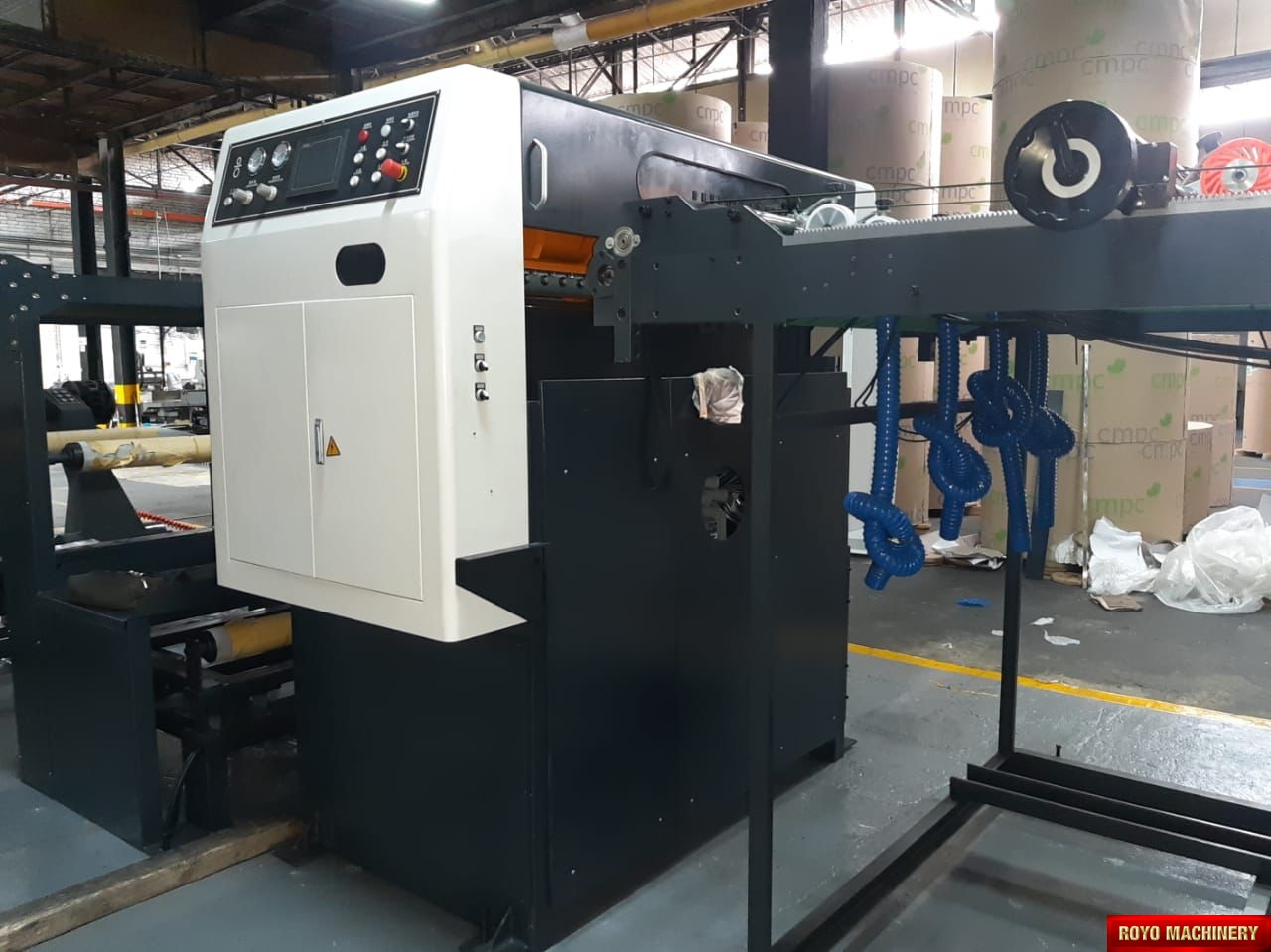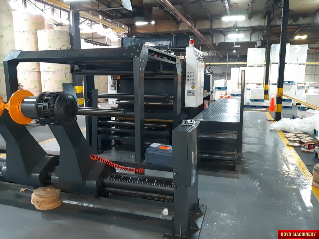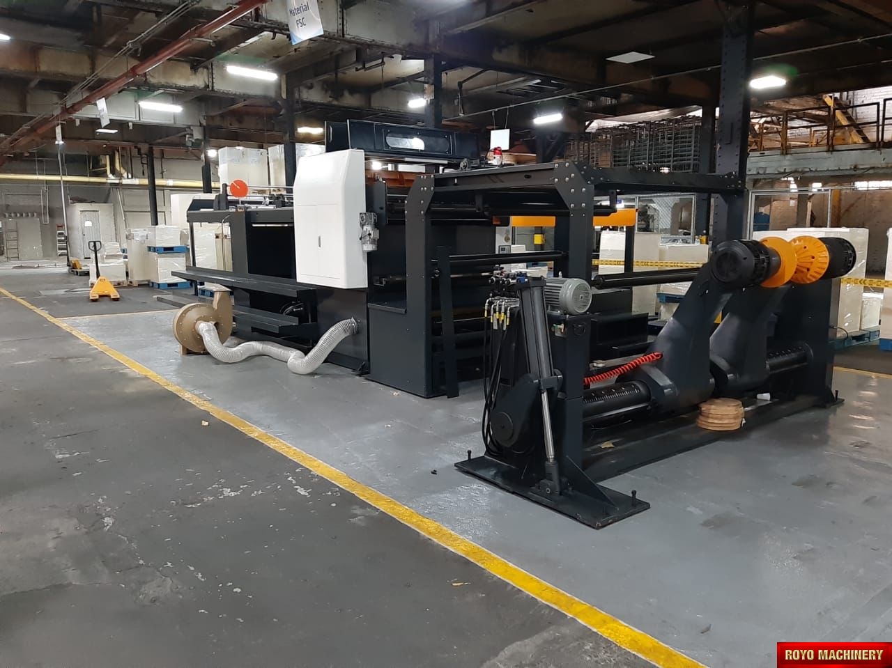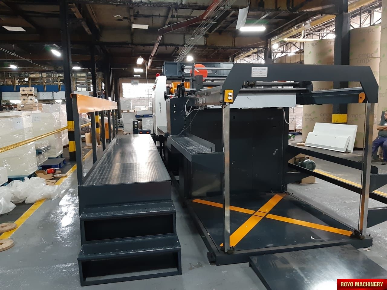 Paper tensioning control, Rotary upper knife and fixed lower knife, Total Weight: 11000kg, Max. Paper Width: 1400mm, Max. cutting speed: 300 cuts/min, Color LCD operating panel, Auto cut length adujstment system, Self adjusting air brakes, Rotary Knife, Paper thickness: 60-550 gsm, Overlapper & piler, Max. roll diameter: 1800mm, Dimensions: 7831 x 2151 x 1850 mm, Cut-off range: 18-55", Cut off tolerance: +/- 0.5mm, 1x Roll Stand, Suggested HS code: 8441.10.0000