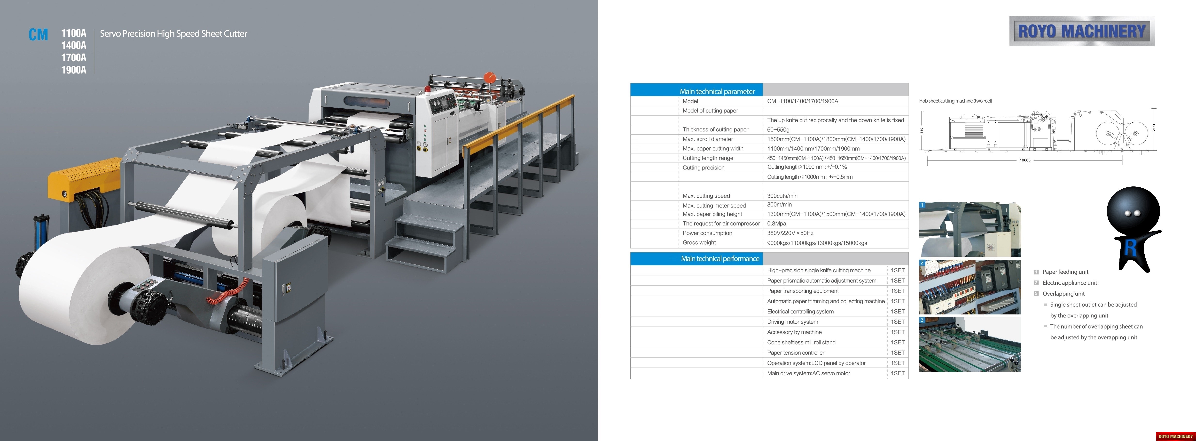 Total Weight: 15000kg, Self adjusting air brakes, Rotary upper knife and fixed lower knife, Rotary Knife, Paper thickness: 60-550 gsm, Paper tensioning control, Overlapper & piler, Max. roll diameter: 1800mm, Max. Paper Width: 1700mm, Max. cutting speed: 300 cuts/min, Dimensions: 10625 x 2151 x 1850 mm, Cut-off range: 18-65", Cut off tolerance: +/- 0.1-0.5mm, Color LCD operating panel, Auto cut length adujstment system, 2x Roll Stands, Suggested HS code: 8441.10.0000