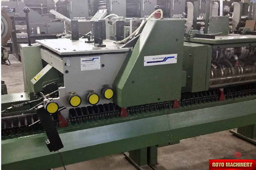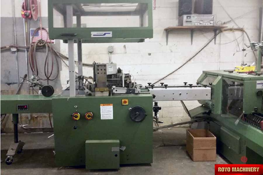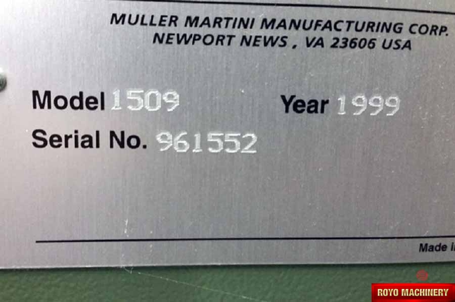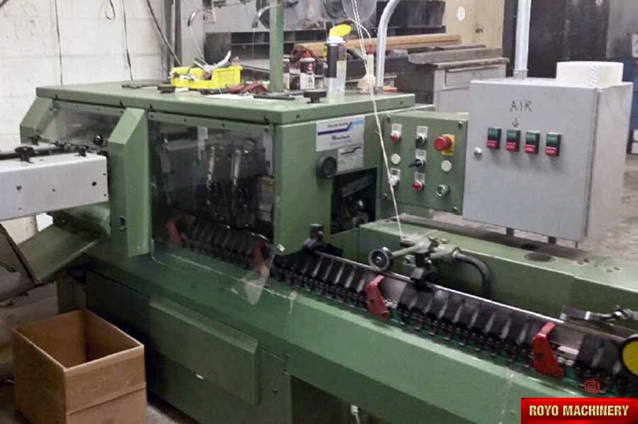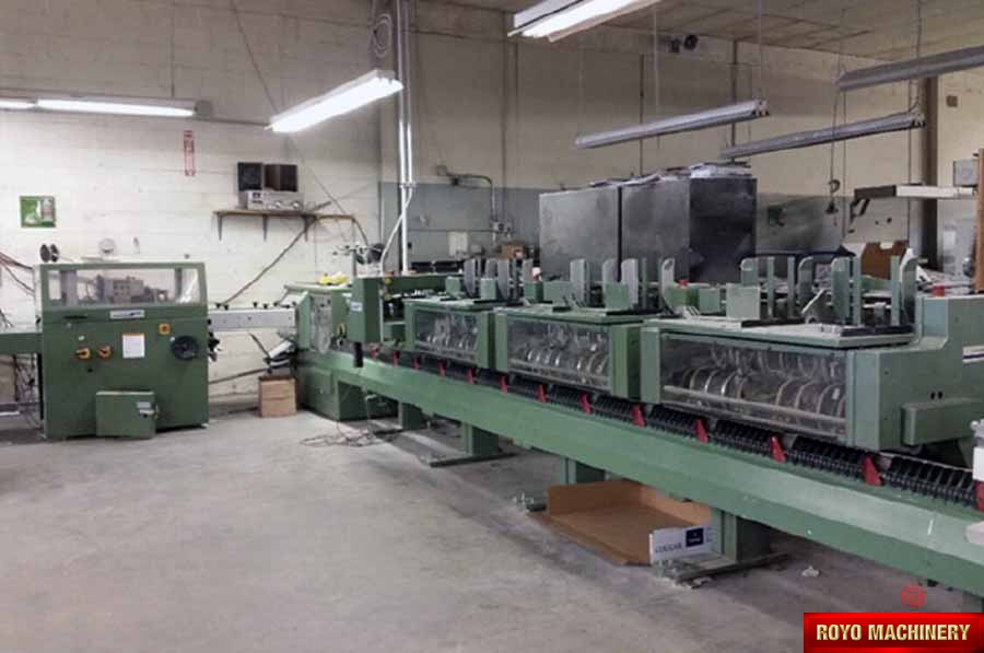 Cover feeder, Hand fed station, Saddle stitcher, Three knife trimmer, Belt delivery, 6 pockets, 2 head stitcher, 8000 Cycles per hour, Max. size untrimmed: 14 3/8" x 12 1/4"