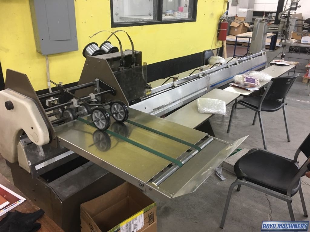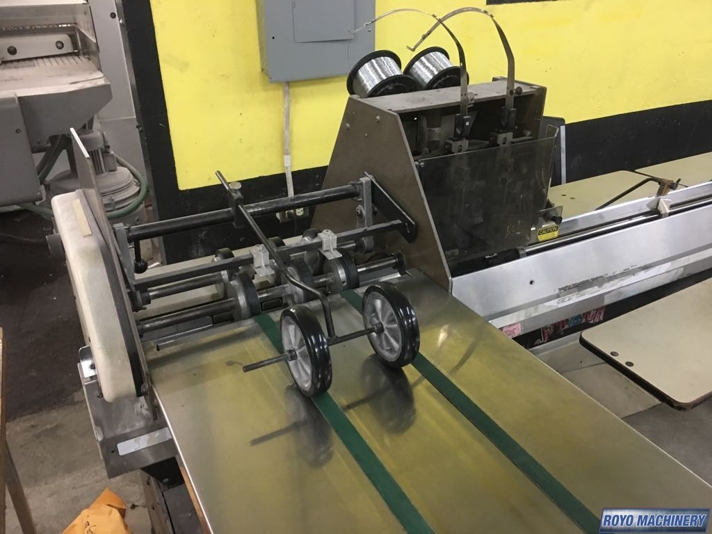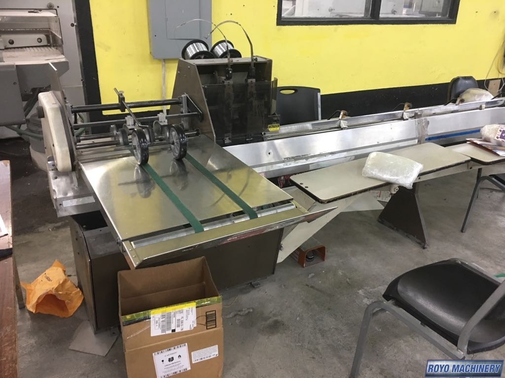 Max. Trim Thickness (Finished Booklet): 3/8", 2 head stitcher, Belt Delivery, Saddle stitcher, Cycling speed: 1800 to 5000 book per hour, Min. Book Size: 4" x 7", Max. Stitch Space (Center to Center): 9 3/4", Min. Stitch Space (Center to Center): 2 1/8"